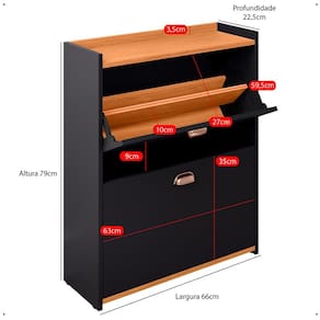 Fabricada em MDP de alta qualidade, oferece resistência e durabilidade. Conta com duas gavetas basculantes com prateleiras, ideais para armazenar até 12 pares de calçados, mantendo tudo organizado e harmonioso.