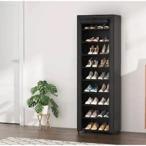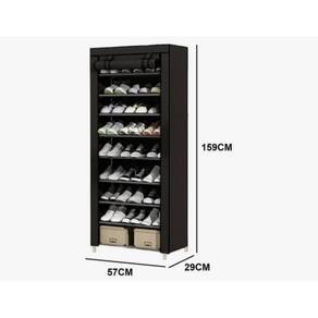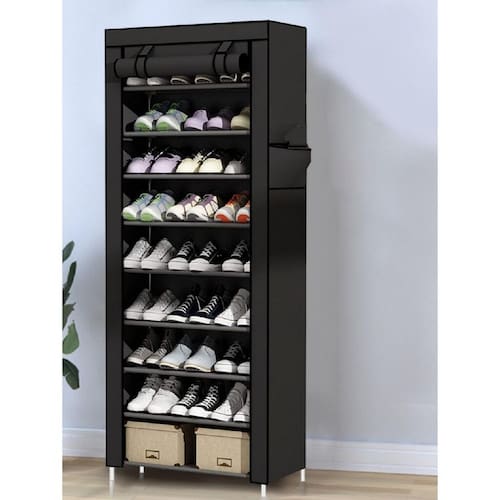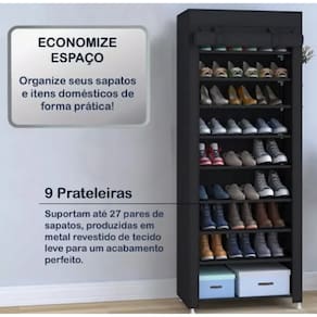 sapateira com capa Sapateira com Capa e 9 Prateleiras – Grande Capacidade e Organização Inteligente\nMantenha seus calçados sempre organizados, limpos e protegidos com a Sapateira com Capa e 9 Prateleiras. Com estrutura reforçada e excelente capacidade, ela acomoda até 27 pares de sapatos, sendo ideal para famílias, closets ou para quem tem muitos calçados.\nPrincipais Benefícios:\n9 prateleiras espaçosas, com capacidade média de até 3 pares por nível\nCapa protetora com zíper, que protege contra poeira e umidade\nMaterial leve, resistente e respirável (TNT com estrutura em aço)\nDesign vertical e compacto, aproveita melhor o espaço disponível\nMontagem simples e rápida, sem necessidade de ferramentas\nConteúdo da Embalagem:\n1 Sapateira com estrutura completa\n9 prateleiras em TNT\n1 capa com zíper\nConectores plásticos\nManual de montagem passo a passo\nIdeal para:\nQuartos, corredores, lavanderias ou closets\nOrganizar sapatos, tênis, sandálias, botas leves, etc.\nQuem busca praticidade e proteção para seus calçados\nEspecificações:\nQuantidade de prateleiras: 9\nQuantidade de pares de sapatos: 2\nAltura x Largura x Profundidade 160 cm x 58 cm x 28 cm\nCom rodas: Não\nÉ giratório: Não