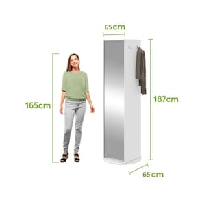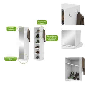 Características: 4 Ganchos laterais 6 Nichos 1 Porta com espelho 2 Prateleiras com altura regulável Base Giratória 360° para melhor aproveitamento do espaço Espelho interiço na face frontal Estrutura em MDP/MDF