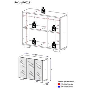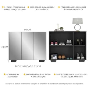 Dimensões do produto montado: Altura: 74cm | Largura: 90cm | Profundidade: 32cm *Você pode consultar as medidas internas na imagem técnica do produto.