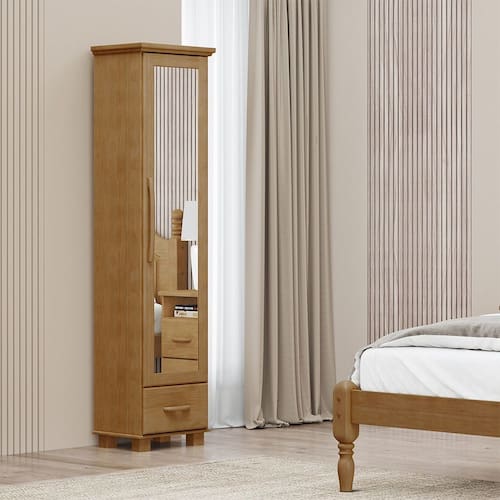 Características: Estrutura 100% em Madeira Maciça de Pinus Pintura Acetinada Verniz PU e UV Amplo espaço para armazenamento 01 Gaveta com Corrediças Telescópicas 01 Porta com Espelho e Dobradiças com Amortecimento Prateleiras Internas Puxadores e Pés em Madeira Maciça Peso Máximo Suportado pela Gaveta 05kg Distribuídos Peso Máximo Suportado pelas Prateleiras 10kg Distribuídos Isolamento de Peças com Manta de Polietileno Expandido (Isomanta)