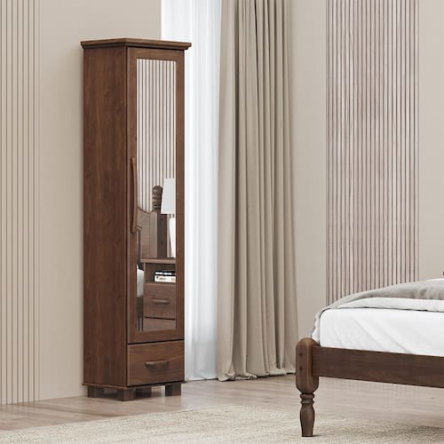 Características: Estrutura 100% em Madeira Maciça de Pinus Pintura Acetinada Verniz PU e UV Amplo espaço para armazenamento 01 Gaveta com Corrediças Telescópicas 01 Porta com Espelho e Dobradiças com Amortecimento Prateleiras Internas Puxadores e Pés em Madeira Maciça Peso Máximo Suportado pela Gaveta 05kg Distribuídos Peso Máximo Suportado pelas Prateleiras 10kg Distribuídos Isolamento de Peças com Manta de Polietileno Expandido (Isomanta)
