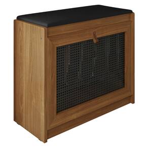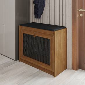 Este é um banco sapateira fabricado em madeira maciça, com acabamento em verniz PU e detalhe rústico em ratan na porta frontal. Possui formato retangular e estrutura para instalação no chão, indicado para ambientes como quartos, salas, halls e espaços multiuso. O produto inclui uma prateleira interna em madeira e suporta até 120 kg de peso distribuído. A porta é basculante, permitindo acesso ao compartimento interno. O assento é estofado com espuma D14. Requer montagem. As dimensões são: largura 60 cm, profundidade 26 cm, altura 51 cm, peso total de 7 kg. A cor apresentada é Nature/Preto. Fabricado em madeira reflorestada.
