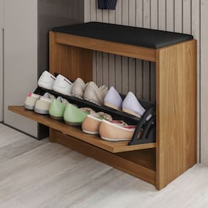 Material principal: Madeira Maciça Acabamento: Verniz PU Detalhe decorativo: Porta em ratan Tipo de porta: Basculante Quantidade de prateleiras: 1 Assento: Estofado com espuma D14 Capacidade de carga: Até 120 kg Quantidade de pares de sapatos: 6 Requer montagem: Sim Tipo de instalação: Chão Ambientes indicados: Halls, Entradas, Quartos, Salas, Multiuso Peso do produto: 7 kg Dimensões (L x P x A): 60 cm x 26 cm x 51 cm Nature/Preto Marca: Carisma Fabricante: Carisma Móveis