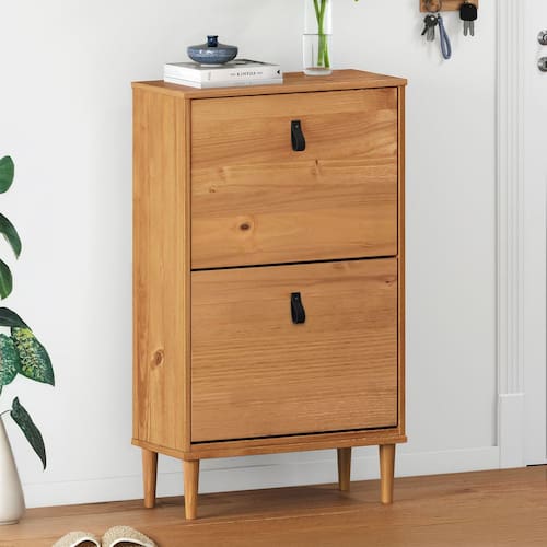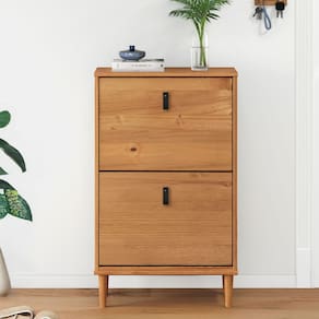 Produzida em madeira maciça de alta qualidade, este Móvel Compacto de Organização de Sapatos é resistente e durável, trazendo um toque natural ao ambiente. Os puxadores de couro adicionam um detalhe elegante e moderno, enquanto os pés levemente torneados conferem um charme escandinavo ao design.