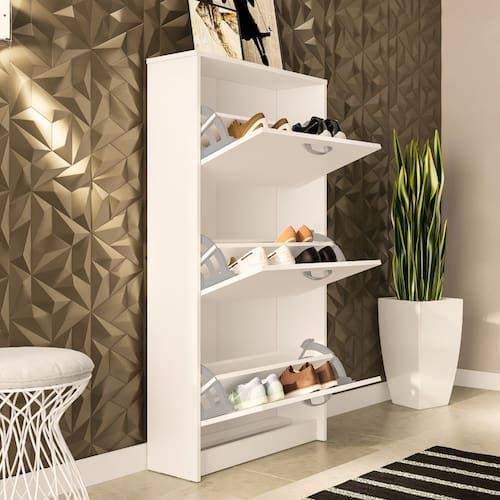 Características: Estrutura MDP Pintura UV 04 Portas basculantes Espaço para 12 calçados Puxadores de Plástico Peso suportado na Gaveta: 6kg