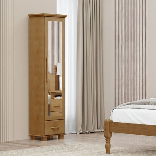 ESPECIFICAÇÕES TÉCNICAS:<Br> Produto 100% Madeira Maciça de pinus de reflorestamento;<Br> Pintura Acetinada Verniz PU e UV;<Br> Corrediças telescópicas;<Br> Dobradiças com amortecimento;<Br> Puxadores e Pés em madeira maciça;<Br> Peso máximo suportado pelas Gavetas 05kg distribuídos;<Br> Peso máximo suportado pelas Prateleiras 10kg distribuídos;<Br> Porta com espelho;<Br> Amplo espaço para armazenamento;<Br> Isolamento de peças com manta de polietileno expandido (Isomanta);<Br> Possui manual de montagem;<Br> Sistema de montagem simples e rápida.<Br><Br>