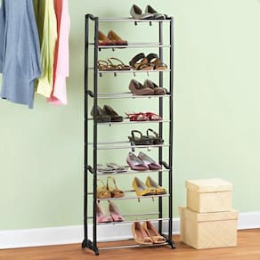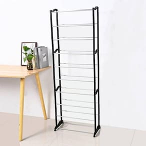 Material: Metal e Plástico (PVC)Dimensões: 50?cm de largura 16?cm de profundidade 139?cm de alturaPeso: 900gCor: PretaCapacidade: Até 10 pares (estimado, conforme tipo de calçado)Montagem: Simples e intuitiva