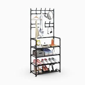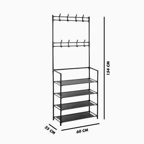 - Estrutura Robusta e Durável: Fabricada em ferro de alta qualidade, a estrutura metálica oferece grande resistência e durabilidade, suportando o peso dos objetos armazenados. O design combina o cabideiro para roupas e o suporte para sapatos de forma funcional e eficiente.
