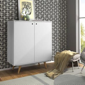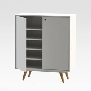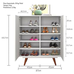 A Sapateira Retrô 50, possui portas de rotação em MDF, prateleiras para acomodação de diversos sapatos (20 pares). Possui pés palito em madeira, trazendo o design Retrô.