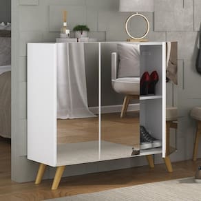 A Sapateira Retrô com Espelho 3 Portas Nina Multimóveis é produzida em MDP com acabamento acetinado (cerca de 20% de brilho), que garante maior durabilidade, facilidade na limpeza, além de um acabamento superior. Com 3 portas, possui um excelente espaço interno para acomodar seus sapatos e demais pertences (as prateleiras internas suportam 2 e 5 Kg e o tampo 7 Kg). Os pés retrô, em polipropileno, dão um charme especial ao móvel deixando-o com um visual leve e permitindo você compor um ambiente com ar vintage e moderno ao mesmo tempo. Os espelhos na porta deixam o móvel mais requintado, criando um ambiente moderno e charmoso. Os espelhos são de vidro (o que evita que a imagem fique distorcida) e lapidados, ou seja, passam por um processo para que as bordas não fiquem cortantes, o que garante maior segurança. Compacta, é uma excelente opção para otimizar seu ambiente, para que você possa aproveitá-lo da melhor maneira possível.
