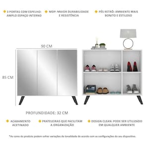 A Sapateira Retrô com Espelho 3 Portas Nina Multimóveis é produzida em MDP com acabamento acetinado (cerca de 20% de brilho), que garante maior durabilidade, facilidade na limpeza, além de um acabamento superior. Com 3 portas, possui um excelente espaço interno para acomodar seus sapatos e demais pertences (as prateleiras internas suportam 2 e 5 Kg e o tampo 7 Kg). Os pés retrô, em polipropileno, dão um charme especial ao móvel deixando-o com um visual leve e permitindo você compor um ambiente com ar vintage e moderno ao mesmo tempo. Os espelhos na porta deixam o móvel mais requintado, criando um ambiente moderno e charmoso. Os espelhos são de vidro (o que evita que a imagem fique distorcida) e lapidados, ou seja, passam por um processo para que as bordas não fiquem cortantes, o que garante maior segurança. Compacta, é uma excelente opção para otimizar seu ambiente, para que você possa aproveitá-lo da melhor maneira possível.