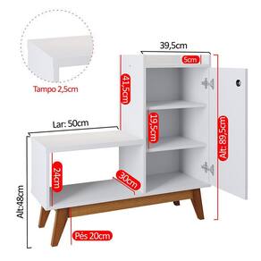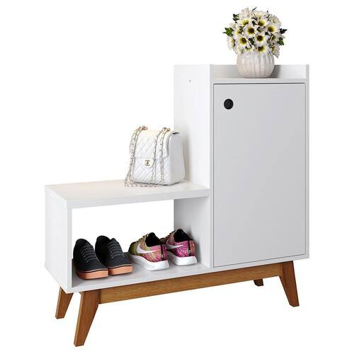 Ela também conta com um assento que possibilita calçar seus sapatos de forma confortável. Abaixo do assento foi inserido um nicho, podendo ser utilizado para acomodar calçados ou itens decorativos.