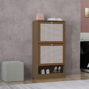 Sapateira Tropical 2 Portas Carvalho Sapateira Tropical 2 Portas - Organizacao e Estilo para Seus Sapatos Dimensoes Montado: Altura 1,09 m | Largura 0,56 m | Profundidade 0,26 m Material: Estrutura em BP (Laminado decorativo de baixa pressao), oferecendo resistencia superior a riscos, umidade e manchas. Portas com pintura 3D que imita a palha indiana, proporcionando um toque elegante e diferenciado Caracteristicas: Ideal para quarto, closet ou lavanderia. Design vertical compacto para maximizar o espaco. 2 portas para armazenar sapatos de forma organizada. Montagem facil e rapida. Cores modernas e criativas para transformar seu ambiente Organizacao: Armazene seus sapatos de forma pratica e organizada Estilo: Design exclusivo com pintura 3D que imita a palha indiana Durabilidade: Material resistente que garante longa durabilidade