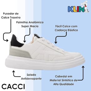 O Tênis Infantil Klin foi desenvolvido para oferecer praticidade, conforto e estilo no dia a dia das crianças. Conta com cabedal em material sintético de alta qualidade que garante durabilidade e acabamento moderno, além do solado antiderrapante que proporciona segurança em cada passo. A palmilha anatômica super macia oferece bem-estar prolongado, tornando o calçado ideal para acompanhar os pequenos em todas as atividades.