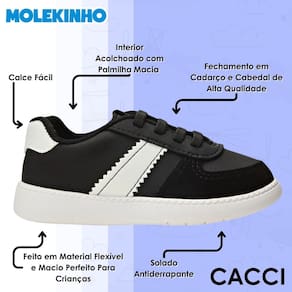Fechamento em cadarço elástico: Pensado para facilitar o dia a dia dos pequenos e dos pais, oferece um ajuste perfeito e prático, garantindo que o sapatênis fique firme nos pés sem apertar ou incomodar.
