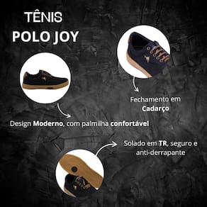 Os Sapatênis masculinos produzidos pela Polo Joy oferecem um novo visual para quem busca conforto, qualidade e estilo. Trabalhados em material leve e resistente, nossos modelos chegaram para elevar seu look. O Sapatênis Polo Joy oferece leveza ao caminhar graças ao seu solado macio e palmilha confort 4mm, perfeito para seu dia a dia.