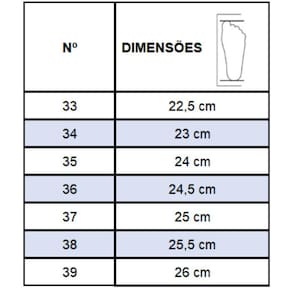 Recomendações de Uso: A limpeza do calçado pode ser feita com Detergente neutro e pano úmido. Não deixar submerso em água e não utilizar nenhuma forma de calor para secar. Guardar em local sem umidade.