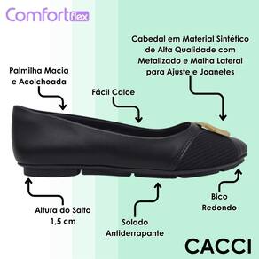 A sapatilha feminina da ComfortFlex foi criada para oferecer elegância e bem-estar ao longo do dia. O cabedal é confeccionado com material de alta qualidade e conta com detalhe metalizado, além de malha lateral que se adapta com suavidade aos pés, proporcionando conforto extra em áreas delicadas como a dos joanetes. O design com bico redondo complementa o visual com discrição e charme.