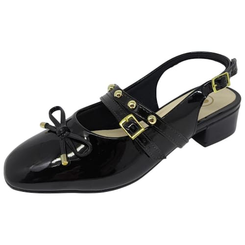 O cabedal em material envernizado de alta qualidade traz um visual sofisticado, com acabamento brilhante que realça cada detalhe do design. O laço delicado na parte frontal adiciona uma dose de romantismo ao modelo, enquanto as tiras com pins dourados dão um toque moderno e cheio de personalidade. Para completar, a tira ajustável que permite um ajuste preciso e seguro, facilitando o calce e garantindo mais firmeza ao caminhar.