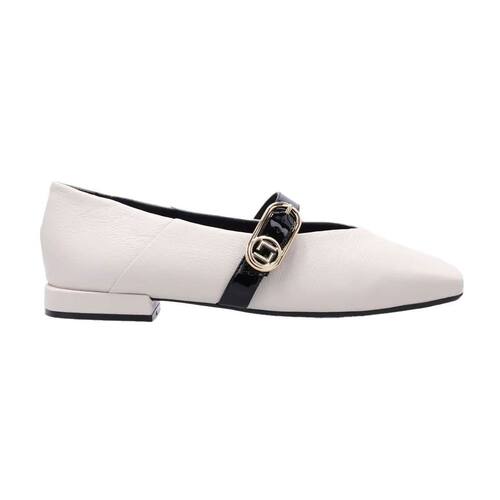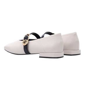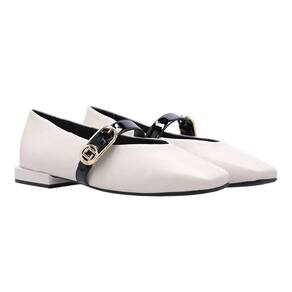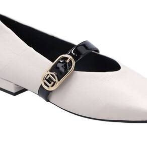 Sapatilha com cabedal e gáspea com recorte suave em V. Possui tira com fivela oval alongado no peito de pé e salto forrado