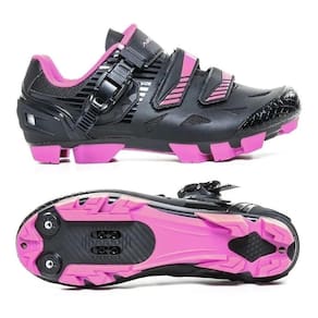 Sapatilha MTB Feminina Absolute Luna Preto/Rosa Tam: 37 Br A sapatilha Absolute Luna, vem para atender o público feminino de ciclistas com muito conforto, robustez e preço justo. Conta com solado de alta rigidez e resistência sem aumentar o peso da sapatilha, além de contar com aspectos básicos para a pratica do Mountain Bike. Projetada para suportar desde pedaladas recreativas até fortes treinos, essa sapatilha foi produzida em couro sintético com perfurações que evitam o superaquecimento dos pés e auxiliam na redução da umidade causada pelo suor fornecendo maior conforto e ventilação.