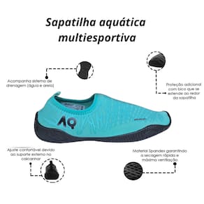 A Sapatilha aquática Multiesportiva foi feita para você surfar, mergulhar, usar em embarcações, Jet ski e caminhadas na praia. A Aqurun é confeccionada com tecnologia Spandex, um material sintético que se mantém justo ao pé para melhorar nos movimentos e com secagem rápida.