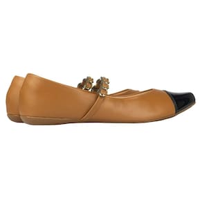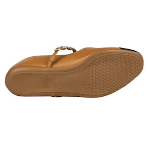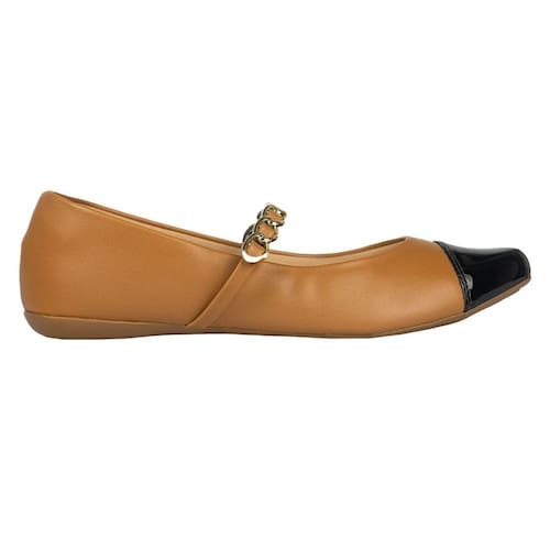 Sapatilha moderna e confortável. Com tira no peito do pé, estilo sapato boneca, com detalhes simulando uma corrente.