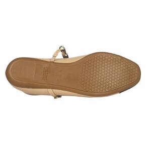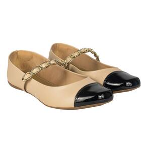 Sapatilha moderna e confortável. Com tira no peito do pé, estilo sapato boneca, com detalhes simulando uma corrente.
