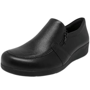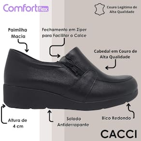 Confeccionado em couro de alta qualidade, o mocassim conta com um acabamento refinado e durável, que proporciona um toque macio e uma aparência elegante. Seu design clássico com bico arredondado traz um visual atemporal, enquanto o salto anabela de 3 cm oferece a elevação ideal para garantir estabilidade, leveza e conforto durante todo o dia.