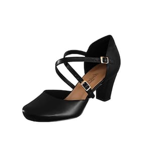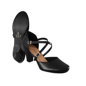 Possui tiras cruzadas no peito do pé com fivela, possibilitando melhor ajuste ao formato dos pés e salto grosso que proporcionam mais segurança e estabilidade durante a dança.