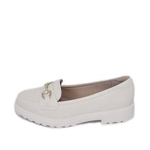O sapato Modare Mocassim Feminino Ultra Conforto, é confeccionado em material sintético (napa) por inteiro e de ótima qualidade. Seu cabedal é um modelo mocassim clássico com detalhes criados pela marca. Possui a língua com entrada lateral e um aplique metalizado sobre ela. Seu solado é tratorado, antiderrapante e tem altura de 3,0 cm. Possui palmilha em PU com pontos em espuma. A parte interna possui leve forração, tornando seu uso muito mais confortável. Possui bico redondo, muito moderno.