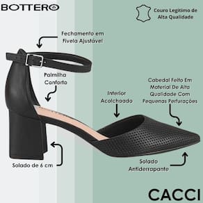 Charme e sofisticação definem este sapato da Bottero, que une sensualidade e conforto em um design moderno e feminino. Confeccionado em couro de alta qualidade, ele apresenta aberturas laterais que deixam o visual mais leve e elegante, enquanto o acabamento refinado valoriza ainda mais a proposta contemporânea. O modelo de bico fino alonga a silhueta e imprime atitude ao look, equilibrado com um salto grosso de aproximadamente 6 cm, que proporciona firmeza ao caminhar e garante o conforto ao longo do dia. A pulseira no tornozelo ajusta-se de forma prática e segura, valorizando o contorno das pernas com delicadeza. O forro têxtil na parte frontal oferece suavidade ao toque, enquanto a palmilha em espuma adiciona maciez a cada passo. O solado emborrachado com boa aderência completa a experiência com mais estabilidade e segurança. Ideal para produções elegantes, essa peça transita com facilidade entre o ambiente de trabalho e ocasiões sociais. Use com vestidos fluidos, saias midi ou calças de alfaiataria para composições que esbanjam personalidade e bom gosto.