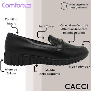 O salto anabela de 3,5 cm proporciona leve elevação com apoio firme, ideal para quem deseja caminhar com mais segurança e sem abrir mão do conforto. Além disso, o formato do bico arredondado favorece o encaixe natural dos pés, evitando desconfortos mesmo após horas de uso.