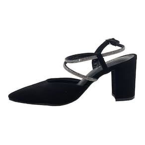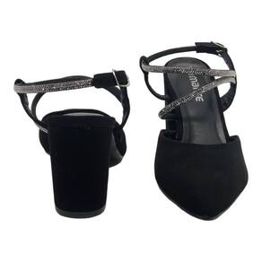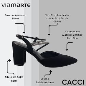 Com um salto alto grosso e um bico fino, esse sapato apresenta uma modelagem que traz a parte do calcanhar aberta, com tiras que se juntam e uma que envolvem o tornozelo, terminando com fechamento prático na lateral do pé.