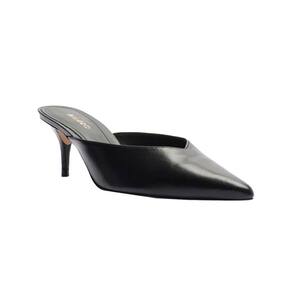 Scarpin Mule feminina marrom tem salto médio fino e ponta fina. Fechada, tem recorte em V no cabedal. Com palmilha da cor da mule e inscrição do nome da marca.