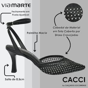 O scarpin feminino da Via Marte é um calçado que se destaca pela elegância. Com salto médio e bico fino, oferece um visual sofisticado. Seu design combina calcanhar aberto e frente fechada com material cravejado, criando uma aparência refinada. Tiras delicadas envolvem a parte exposta do pé, enquanto o fechamento prático na lateral garante um ajuste perfeito. Este modelo une estilo e conforto de maneira impecável.