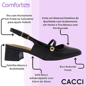 A palmilha macia e acolchoada foi desenvolvida para oferecer conforto prolongado, moldando-se aos pés com suavidade e proporcionando uma sensação de bem-estar a cada passo. O salto bloco de quatro vírgula cinco centímetros é ideal para quem busca altura moderada com total estabilidade, graças ao solado antiderrapante que dá firmeza e segurança ao caminhar. Esse modelo é excelente para usar no trabalho, eventos sociais, reuniões ou em ocasiões especiais onde o conforto é tão importante quanto a elegância. Seja com vestidos midi, calças de alfaiataria ou saias, esse slingback oferece equilíbrio perfeito entre beleza, leveza e funcionalidade.