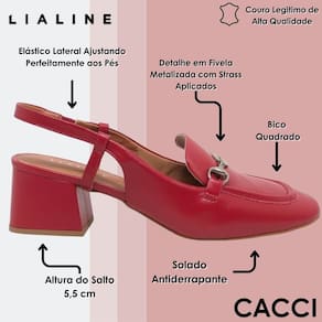 O modelo em Couro Cristal Lia Line Slingback quase sempre fechado na dianteira, mas aberto atrás recebe esse nome pela tira elástica (ou afivelada) na parte posterior facilitando o calce e se encaixando perfeitamente aos pés e que envolve o calcanhar. Possui peça metalizada com strass no cabedal trazendo todo o charme para o calçado.