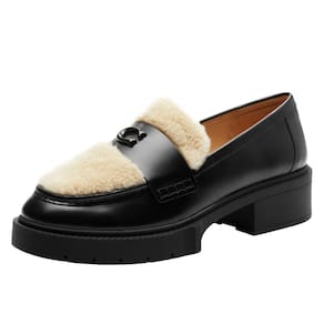 - Cabedal de couro e shearling: Feito de couro liso lustroso e tosquia, este mocassim feminino é finalizado com ferragens de assinatura tonal - para sapatos Coach perfeitamente icônicos para o outono