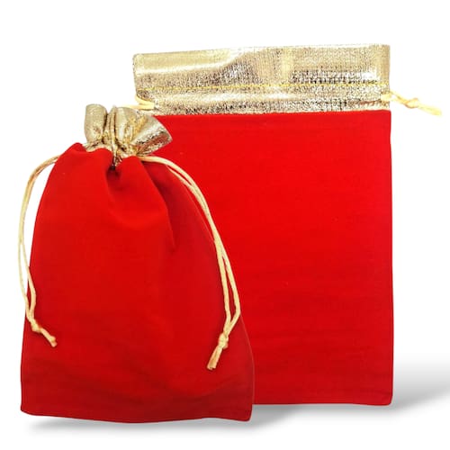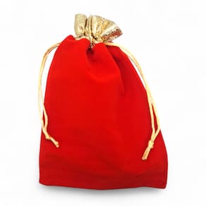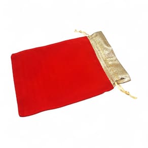 Tamanho: 18 cm x 13 cm Cores: Vermelho com detalhes dourados Material: Veludo de alta qualidade com cordão dourado para fechamento fácil e seguro