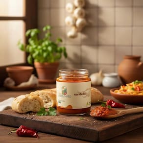 Tradicional da culinária italiana, a Sardella Casa Fortunato é um antepasto clássico que conquista pelo sabor intenso e levemente picante. Preparada de forma artesanal, combina pimentões selecionados, especiarias aromáticas e o toque característico das anchovas, resultando em uma pasta cremosa, encorpada e cheia de personalidade.
