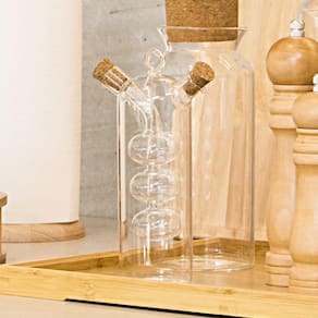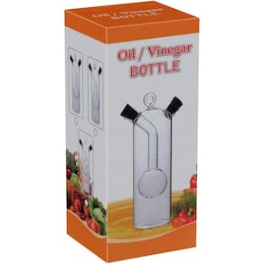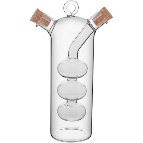 O galheteiro para azeite e vinagre é produzido em borosilicato transparente, um tipo de vidro resistente ao calor e aos elementos químicos.