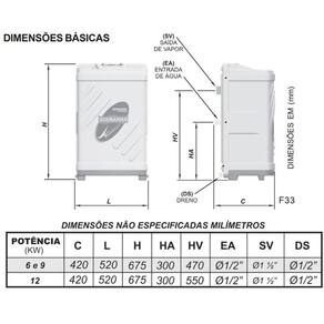 Ambiente: até 6m; Ligação: produto único podendo ser ligado em 220v bifásico ou 220v/380v trifásico no quadro de comando modelo A Sendo necessário somente a alteração do esquema de ligação segue manual com o produto Entrada de água: 1/2'; Saída do vapor: 1.1/2'