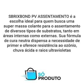 Sbrixbond pv assentamento -  é a escolha ideal para quem busca uma super massa colante para o assentamento de diversos tipos de substratos, tanto em áreas internas como externas. Sua fórmula de cura neutra dispensa a necessidade de primer e oferece resistência ao ozônio, chuva ácida e raios ultravioletas. Além disso, a super massa colante não é afetada em áreas litorâneas. Com sua força de pega e elasticidade, a sbrixbond pv assentamento permite acomodação às movimentações entre base e substrato, distribuindo tensões e impedindo trepidações. Seu poder de adesão é surpreendente, assentando com perfeição a maioria dos materiais, incluindo metal, alumínio, aço, cobre, cimento, cerâmica, mármore, vidro, poliestireno, isopor, concreto, zinco, fibra, rocha ornamental, tijolo, azulejo, cortiça, gesso, porcelana, madeira e derivados, mdf, drywall, fórmica, borracha, acrílico, placa cimentícia, plásticos e pinturas. A sbrixbond pv assentamento é prática e segura, dispensando a necessidade de manipulação e garantindo estanqueidade à água, ar e pó. Isenta de odor, não é corrosiva e nem irrita a pele. É importante realizar testes de adesão antes da aplicação, e não é adequada para pe, pp, teflon e superfícies betuminosas. Se você busca uma solução eficiente e confiável para assentamento de substratos, a sbrixbond pv assentamento é a escolha certa para você