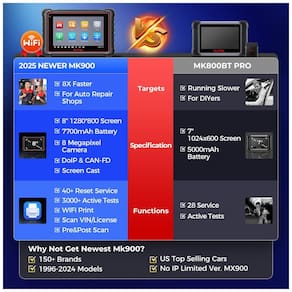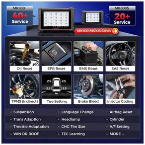Entre as marcas compatíveis estão praticamente todas as principais fabricantes globais, incluindo veículos com protocolos modernos e funções avançadas, como FCA AutoAuth para veículos Fiat Chrysler a partir de 2018. O MK900BT realiza mais de 3000 testes ativos, 40+ serviços de manutenção (reset de óleo, sangramento de freio, calibração, etc.), controle bidirecional, codificação ECU e testes avançados.