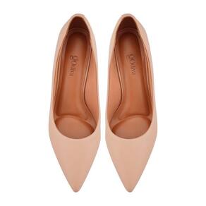 Scarpin fechado com salto médio fino, bico fino, em pelica bege, recorte arredondado no peito do pé e palmilha macia com aplicação da marca Godiva.