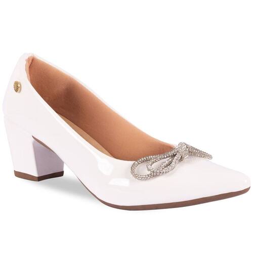 Scarpin Feminino Salto Grosso Verniz Laço Strass - 35 - Branco
