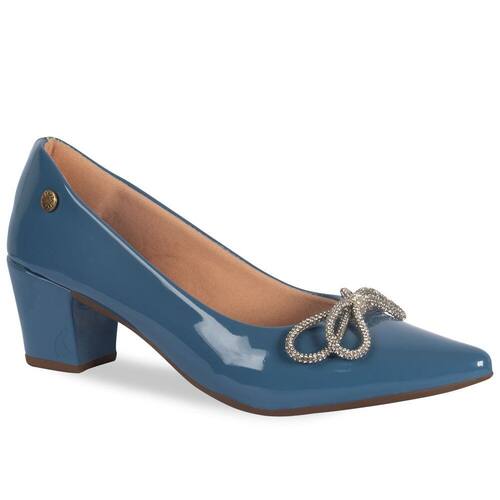 Scarpin Feminino Salto Grosso Verniz Laço Strass - 36 - Azul Petróleo