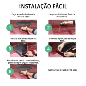 Características: - Entrada de ar funcional; - Para o uso decorativo, nenhuma ferramenta ou perfuração é necessária; - Fácil de instalar e uso durável;- Excelente qualidade; - Ótima decoração e adequada para a maioria dos veículos; - Aplicação é feita com fitas adesivas dupla face; - Produto leve e com alto desempenho.